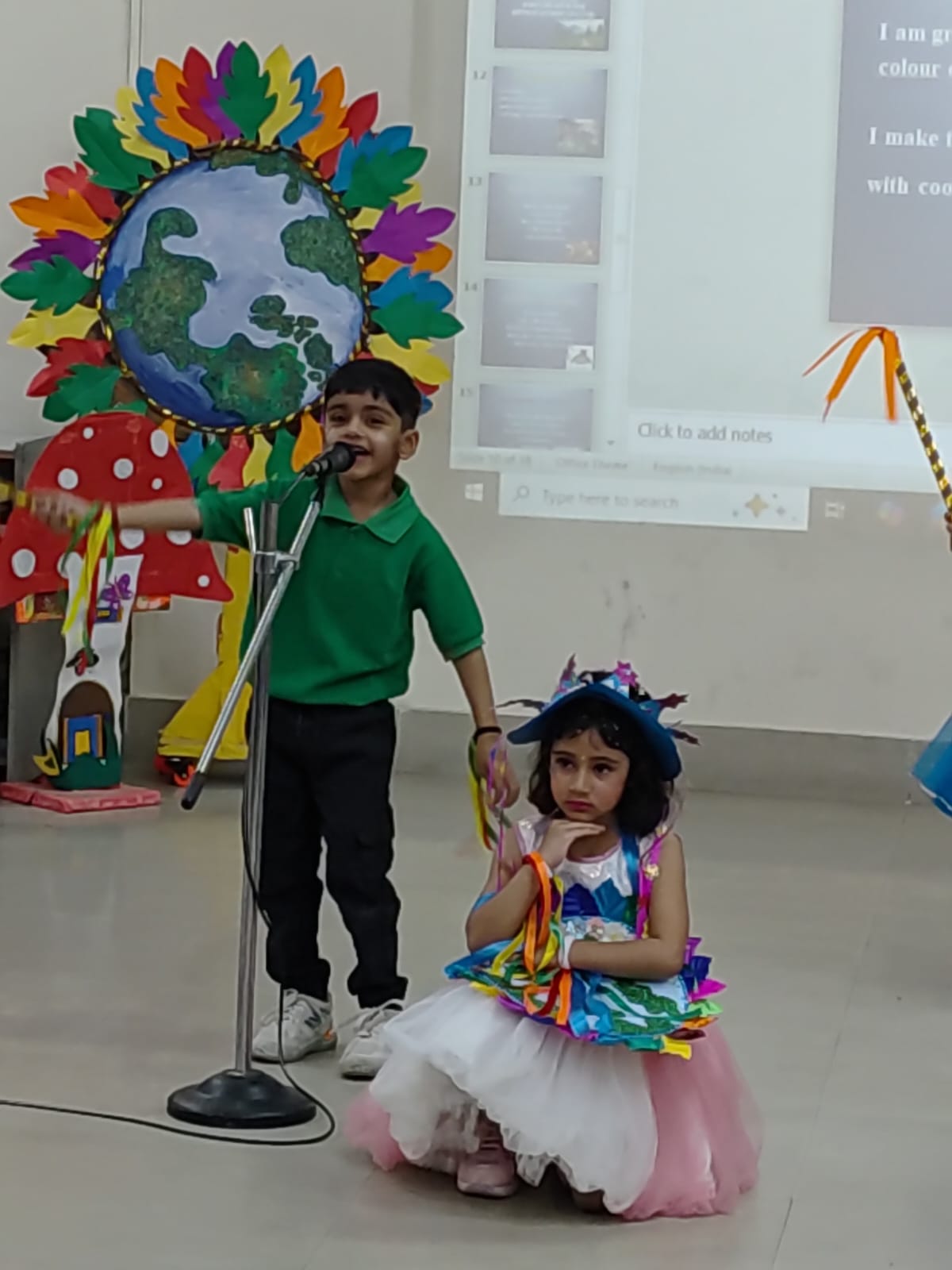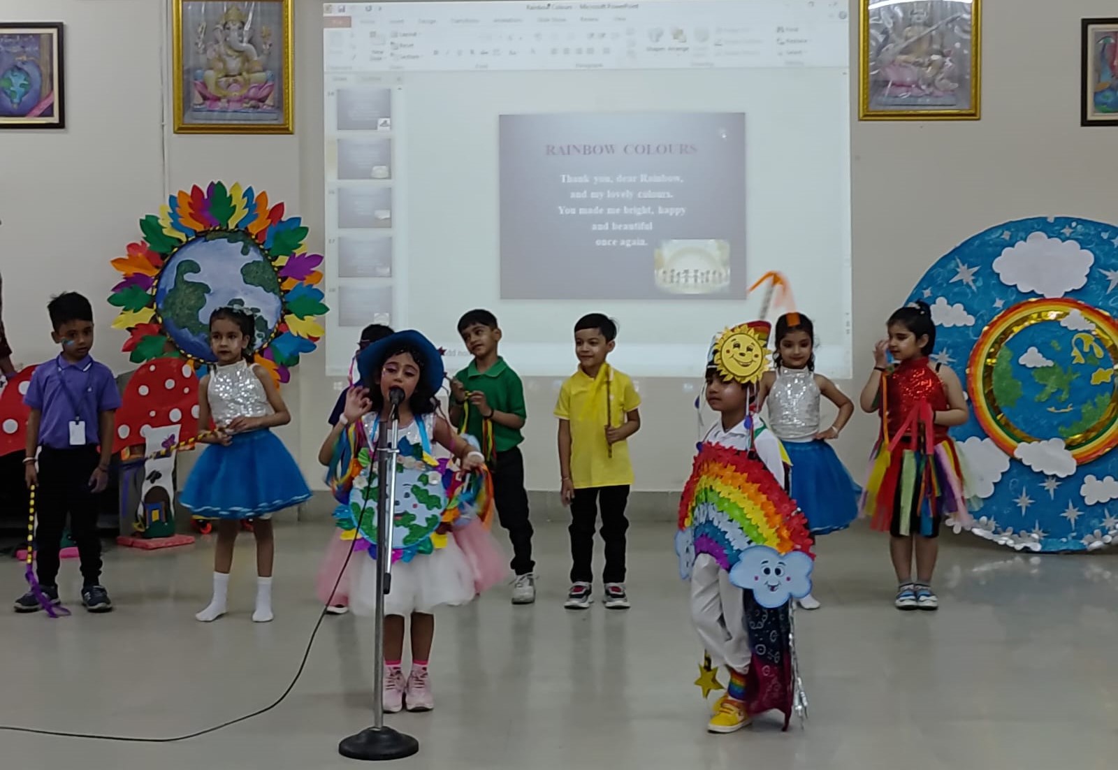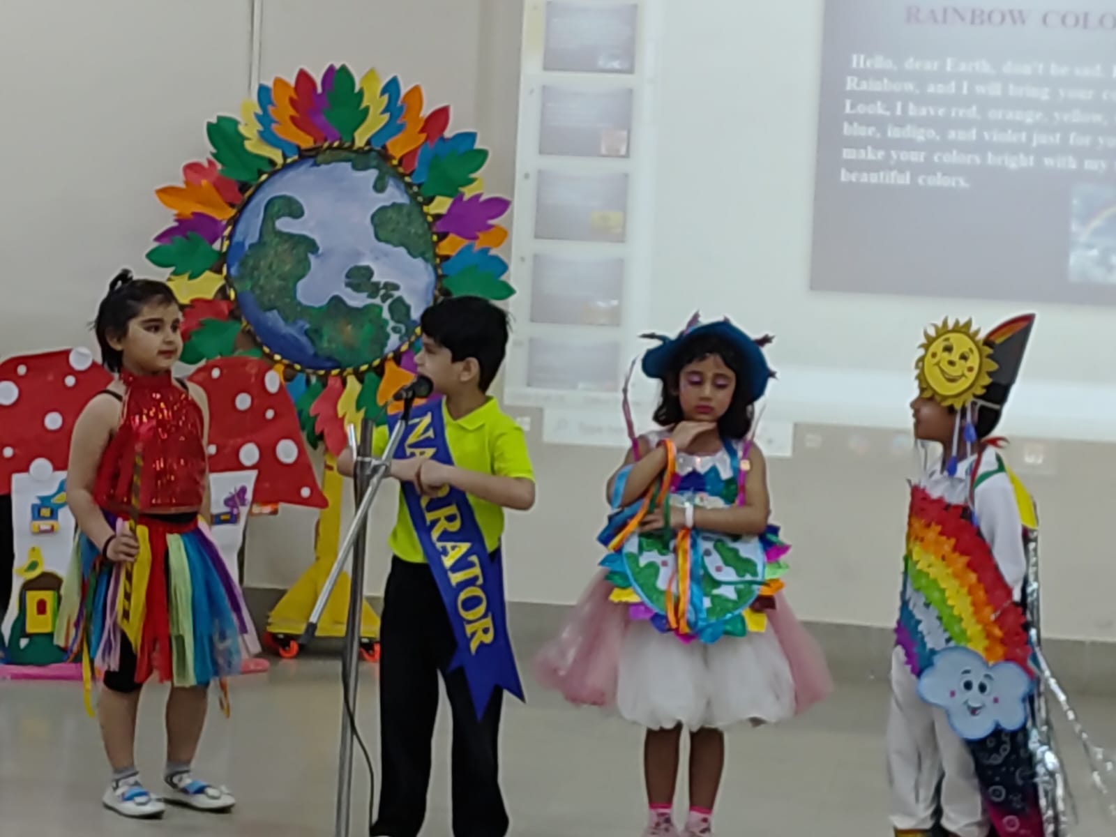 Today the LKG A students presented a beautiful assembly on the topic Rainbow Colours. The children showed the seven colours of the rainbow through a lovely skit. In the story, the Earth becomes sad and the Rainbow King uses his magic to bring back her colours and make the Earth beautiful again.