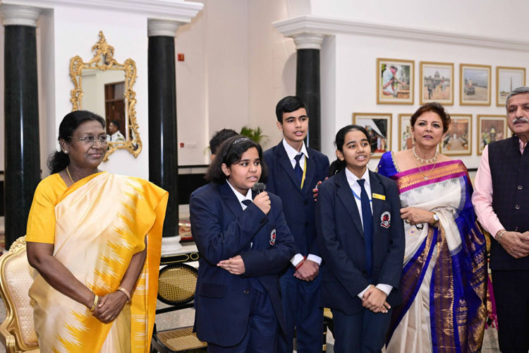 The students, Kamakshi Rana, Harshit, Pankhkudi Medhesia, and Medhansh Kumar, representing classes 6 to 8, were thrilled to meet the Hon’ President of India, Smt. Drupadi Murmu. As a gesture of respect and gratitude, Kamakshi Rana presented a soulful rendition of Vande Mataram song.