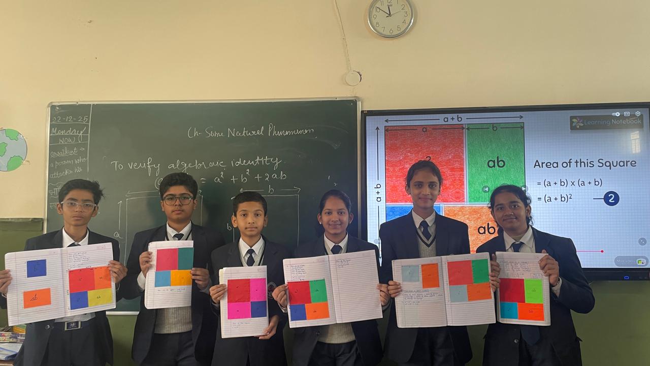 Students used square cut-outs to visually demonstrate algebraic identities such as (a+b)2 = a2+2ab+b2 .